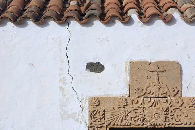 Sobre el encalado antiguo, alguien dejó su firma y cerca de la firma aparece una de las grietas que el paso del tiempo ha dejado en el edificio. “De no arreglarse, la ermita terminará mojándose cuando llueva”, advierte Carreño, mientras no para de recordar la importancia histórica y la necesidad de que el edificio sea restaurado de forma urgente. “Es una pena que, con todo lo que significa para la Isla y para el pueblo de La Oliva, esté así. Debería estar muy mimada, aunque la situación de la ermita es la tónica habitual del patrimonio de Fuerteventura”, añade.