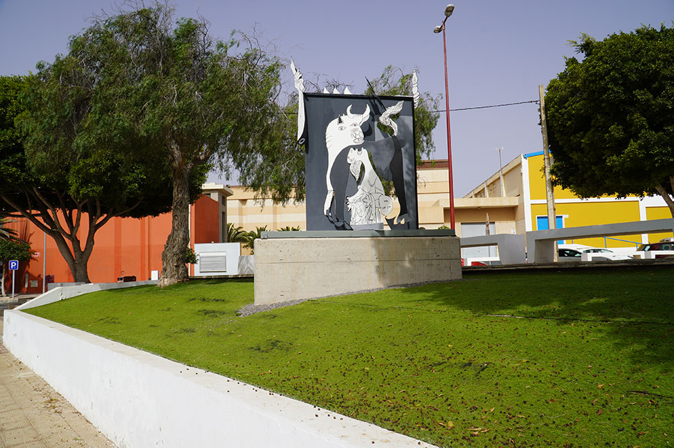 Por deseo del artista de la obra, esta escultura se ha trasladado desde la entrada sur a Puerto del Rosario hasta las 90 viviendas por ser "un lugar emblemático y cultural, situado junto a varios institutos y centros educativos, que alberga ahora una escultura 'Homenaje a Picasso', sometida recientemente a unos pequeños trabajos de restauración, que viene a suponer una oportunidad para que estudiantes cuestionen la figura del artista y lo que representa para el mundo de la cultura", ha explicado el autor de la obra, Toño Patallo.