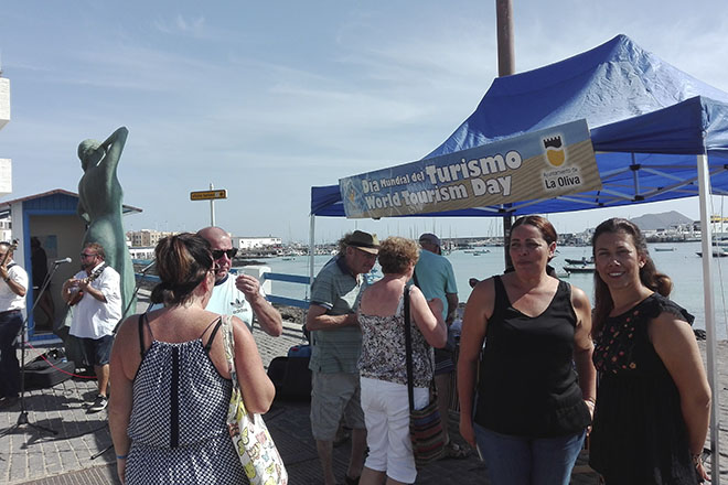 Para conmemorar este Día Mundial del Turismo, la Concejalía de Turismo de La Oliva ofreció hoy a los turistas que pasaron por el Muelle Chico de Corralejo una degustación de productos majoreros amenizado con una típica parranda canaria.