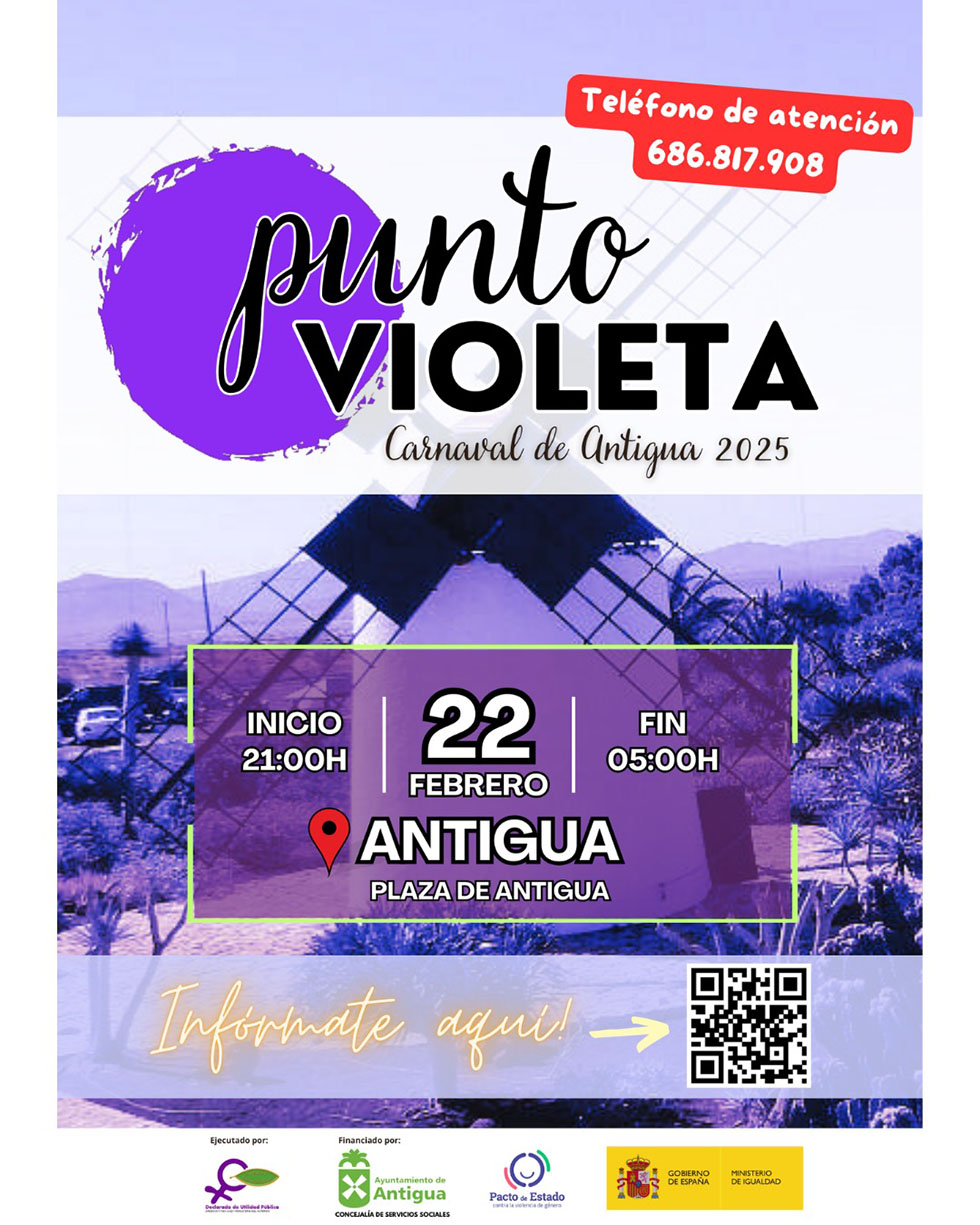 “Disfrutar y pasarlo bien, siendo comprometidos y partícipes todos en que no ocurra ningún incidente en general, y en concreto, relacionado con la violencia de género”, afirma el alcalde, Matías Peña García, y en ese objetivo y en el marco del Carnaval de Antigua, ·facilitamos un Punto Violeta este sábado 22 de febrero desde las 21.00 a las 05.00 horas de la madrugada, al que dirigirse para pedir asesoramiento o directamente ayuda si es necesario”, añade.