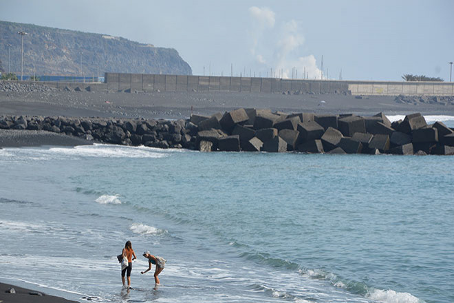 Pasear en Tazacorte con la humareda al otro lado del dique.