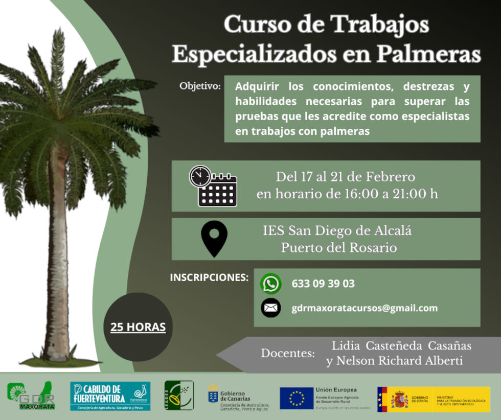 Uno de los cursos destacados es el de Trabajos Especializados en Palmeras, que se desarrollará del 17 al 21 de febrero, de 16.00 a 21.00 horas, en el IES San Diego de Alcalá, en Puerto del Rosario. Esta formación, de 25 horas de duración, impartida por Lidia Castañeda Casañas y Nelson Richard Alberti, permitirá a los participantes adquirir los conocimientos y las habilidades necesarias para superar las pruebas de acreditación como especialistas en trabajos con palmeras.