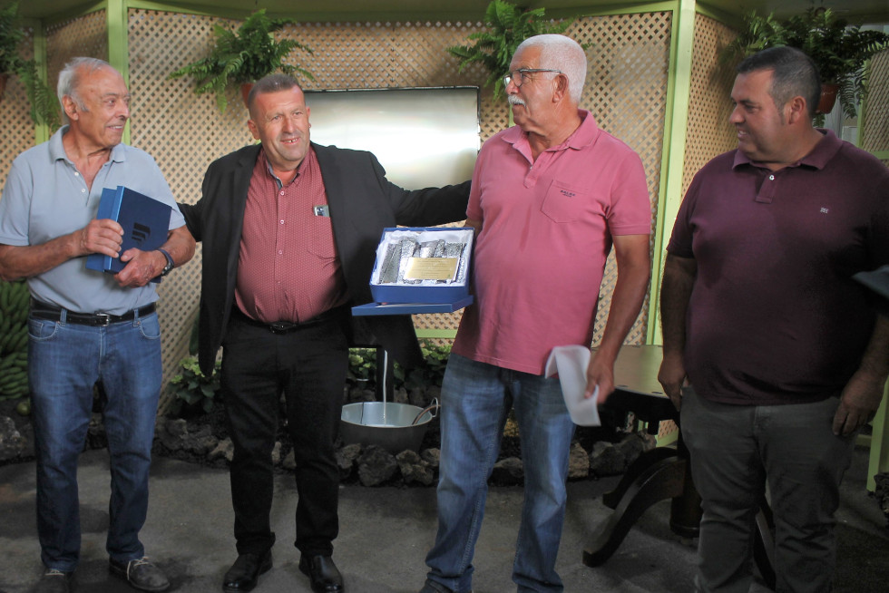 El alcalde de Antigua, Matías Peña y el concejal de Agricultura, Ganadería y Pesca, Fernando Estupiñán, agradecen la colaboración de Pepe y Andrés que no faltan ningún año a esta cita principal en Feaga.