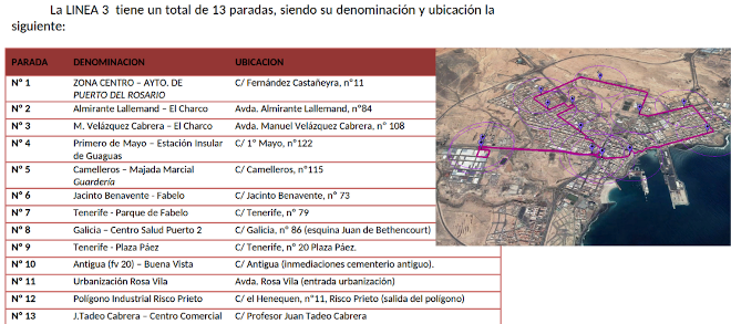 La línea 3, Cuenta con un total de 13 paradas, ocho paradas con marquesina compartida con la línea 2 y 5 paradas no coincidentes con la línea 2 en calle Galicia (Centro de Salud Puerto 2), FV-20, calle Antigua (Buena Vista, frente al cementerio), Avda. Rosa Vila (entrada urbanización Rosa Vila), calle el Henequen, Risco Prieto (salida del polígono) y calle Juan Tadeo Cabrera (Centro Comercial), con salida y fin en la Zona Centro-calle Fernández Castañeyra (Ayuntamiento de Puerto del Rosario).