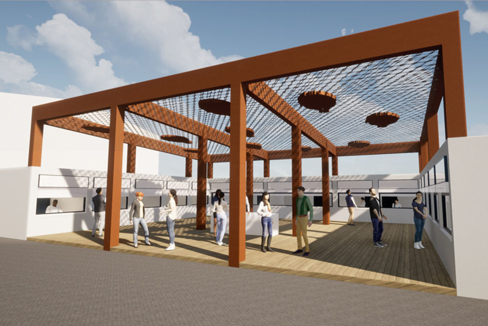 El edificio consta de 16 oficinas de venta distribuidas perimetralmente en torno a una plaza central, cubierta por una pérgola. Las oficinas estarán dotadas de energía y de preinstalación para telecomunicaciones y aire acondicionado en cubierta, protegida por una carcasa, sus dimensiones oscilarán entre 5,30 metros cuadrados y 6 metros cuadrados y tendrán una altura libre de 2,50 metros.