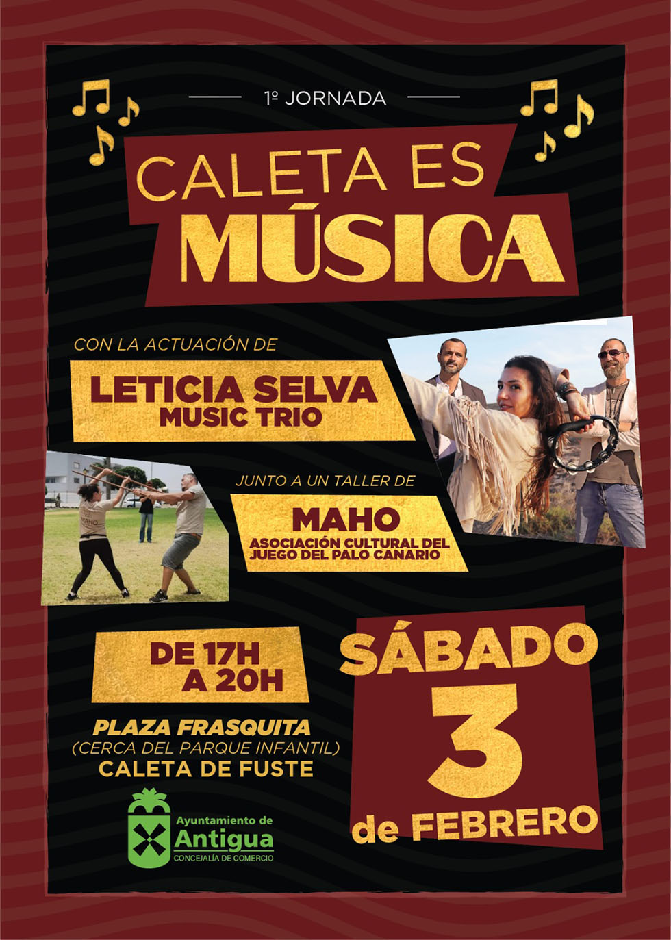 La programación sorprende en cualquier rincón de Caleta de Fuste, y comienza este sábado 3 de febrero, junto a la zona comercial Happy Center de 17.00 a 20.00 horas, con la actuación de Leticia Selva Music Trio y la demostración ofrecida por la Asociación Maho de Palo Canario, abierta a la participación del público.