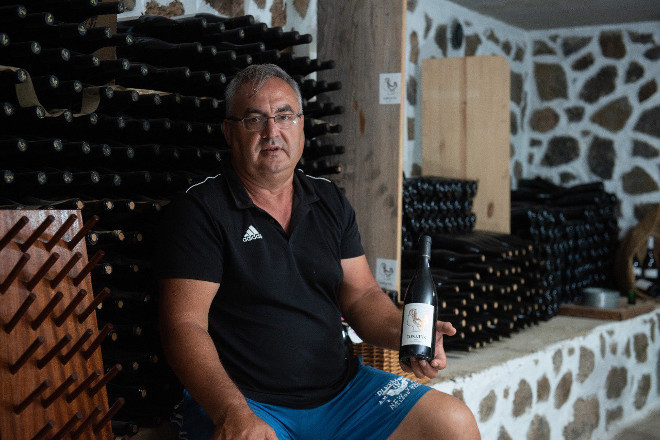 “Mi familia era agrícola y en los años 90 mi tío hacía vino”, recuerda. “Ante la acumulación de uva, decidí iniciar la aventura de producir mi vino, pero con calidad, y contacté por casualidad con el enólogo Alberto González, que me ha enseñado todo para llegar al nivel actual”, resume. En su bodega, Pedro dispone de una habitación destinada a los tanques y, poco a poco, ha ido creciendo.