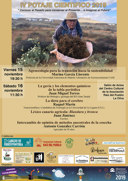 La cosecha; la gavia y los elementos químicos de la tabla periódica; la agroecología para la transición a la sostenibilidad; la dieta del cerebro; el cosco, como alimento de los aborígenes; el léxico agrícola; la música del virtuoso guitarrista, Carlos Cabrera; forman parte, entre otras cosas, del IV Potaje científico dentro de la Semana de la Ciencia de Canarias de ACIISI, que se celebra en Raíz del Pueblo en La Oliva, los días 15 y 16 de noviembre. Junto al III Concurso de potaje de Reserva de la Biosfera de Fuerteventura, en recuerdo de la agricultora y cocinera Lala Carreño.
