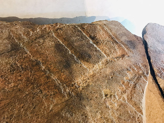 Los podomorfos de la Montaña de Tindaya son imprescindibles para entender esta primera muestra arqueológica del Museo. En la cima de la montaña se han contabilizado 213 grabados con 57 paneles de podomorfos, siluetas de pies, realizadas con diferentes técnicas, siendo las más abundantes los picados de pies.