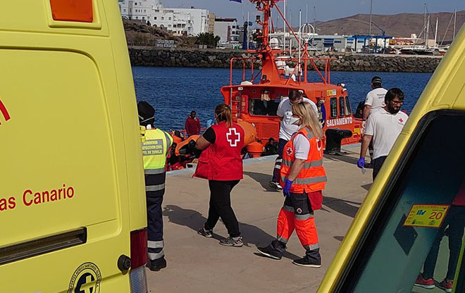Salvamento Marítimo ha desembarcado en el muelle de Gran Tarajal a los 44 inmigrantes, cinco de ellos menores de edad, que viajaban en una patera localizada esta mañana cuando navegaba a 15 millas de la isla.