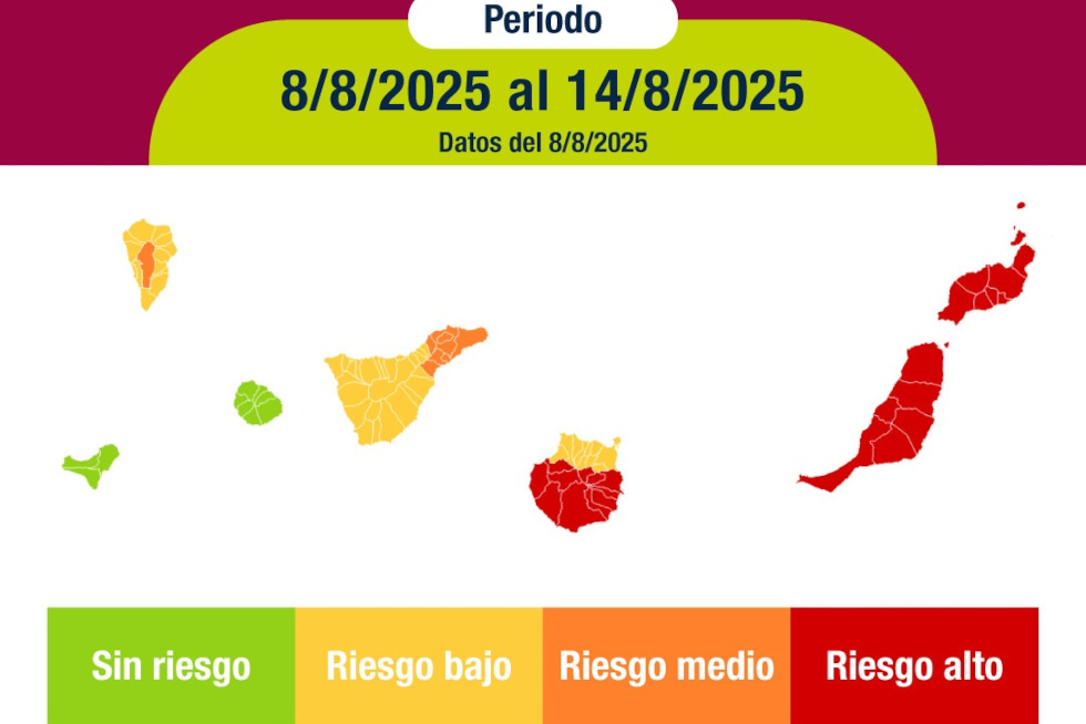 La Dirección General de Salud Pública del Servicio Canario de la Salud (SCS) comunica que, según los datos suministrados por la Agencia Estatal de Meteorología (Aemet) y el Ministerio de Sanidad, se produce un episodio de temperaturas extremas con potencial riesgo en la salud que se espera se extienda durante el fin de semana. En Lanzarote y Fuerteventura se esperan desde este sábado temperatura máxima de 37 grados centógrados, afectando especialmente en zonas de interior y vertientes sureste.
