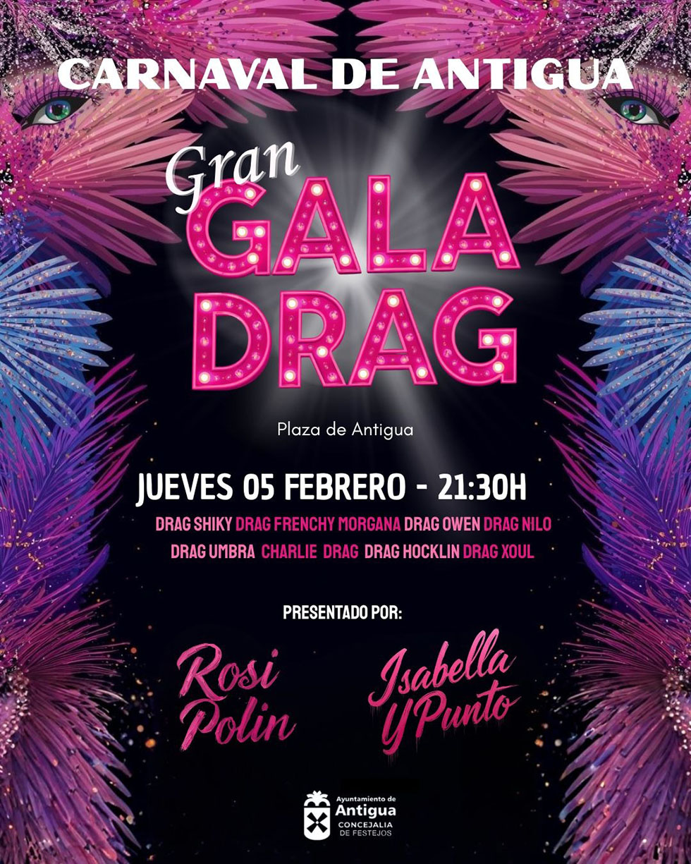El Ayuntamiento de Antigua desde la concejalía de Festejos anuncia la Gran Gala Drag del Carnaval de las Culturas y Lugares del Mundo. “Las mejores Drags de Canarias regresan al Municipio de Antigua para ofrecernos un gran espectáculo presentado por la conocida y cercana, Rosi Polín y la provocadora drag Isabella y Punto”, anuncia el alcalde, Matías Peña.