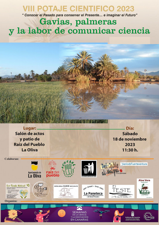 La salud del suelo también importa, y mucho. En el marco de las Semanas de la Ciencia y la Innovación en Canarias 2023, vuelve el Potaje Científico a Raíz del Pueblo, en La Oliva. En busca de alternativas al modelo actual y con el objetivo de plantear un cambio radical de paradigma, la octava edición del Potaje Científico propone “conocer el pasado para conservar el presente e imaginar el futuro”. En esta ocasión, la jornada está dedicada a la simbiosis de gavias y palmeras, así como a la difícil labor de divulgar ciencia.