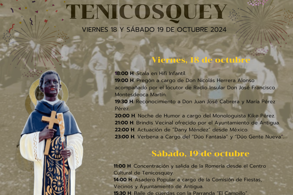 Tenicosquey celebra este viernes y sábado las Fiestas en honor a Fray Escoba, ofreciendo la Comisión de Fiestas y el Ayuntamiento de Antigua un programa para pequeños y adultos en los que no falta pregón, verbenas, noche de humor, fiestas infantiles y actuaciones parranderas, anuncia el alcalde, Matías Peña.