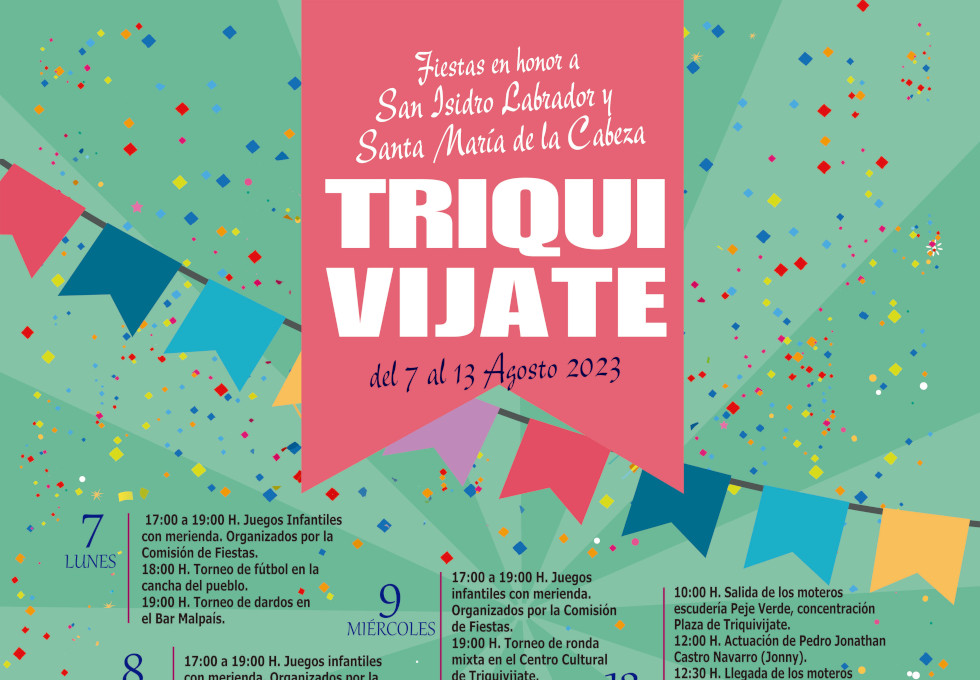 "El Ayuntamiento de Antigua desde la concejalía de Festejos y la Comisión de Fiestas anuncian las Fiestas de Triquivijate en Honor a San Isidro Labrador y Santa María de La Cabeza desde el lunes 7 al domingo 13 de agosto", señala el alcalde, Matías Peña García.