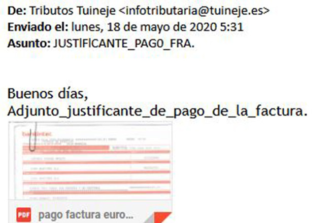 Este lunes el departamento de Nuevas Tecnologías del Ayuntamiento de Tuineje detectó una intromisión en una cuenta de correo electrónico de la institución desde la que se enviaron correos malintencionados que incluían un enlace para la descarga de un justificante de pago de una factura. Este enlace descargaba un fichero comprimido que tenía un virus.