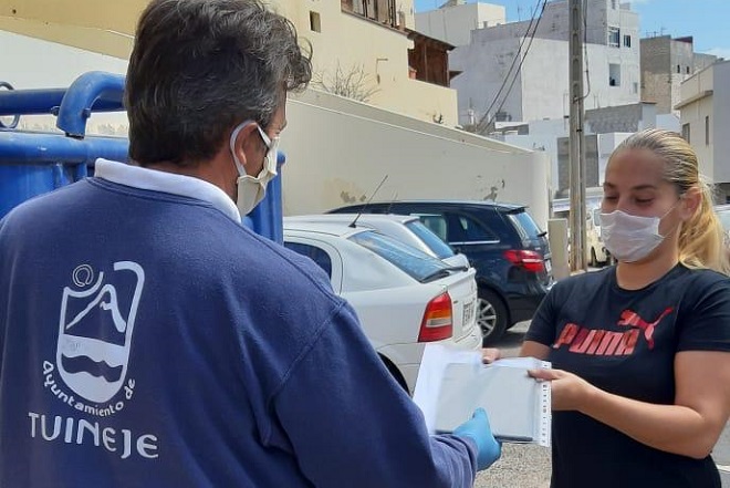 Protección Civil de Tuineje también colabora en las tareas de reparto de tabletas, ordenadores y material didáctico que los diferentes centros educativos necesitan hacer llegar a su alumnado ante la situación provocada por la crisis sanitaría de la Covid-19.