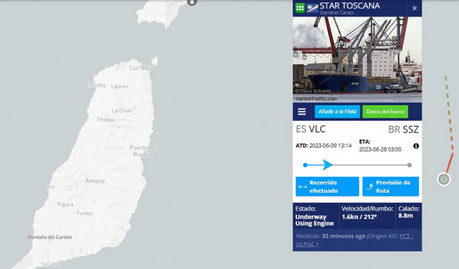 Su SOS llevó a que Salvamento pidiera a todos los buques en ruta por esa zona que estuvieran vigilantes, un aviso al que respondió este martes el Star Toscana, un carguero de casi 200 metros de eslora con bandera de Islas Marshall que se dirigía desde Gibraltar a Brasil.