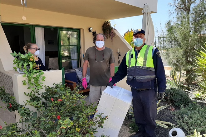 El vecino y portavoz de los Apartamentos Buganvilla en Costa Antigua, Paolo Lirussi, ha donado 500 mascarillas reutilizables destinadas a los agentes de la Policía Local, operarios municipales y técnicos en atención al público del Ayuntamiento de Antigua.