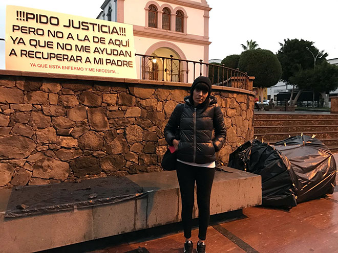 Elisabeth González Montesdeoca, vecina de Puerto del Rosario, de 37 años y madre de dos hijos de 19 y 17 años, lleva dos días en huelga de hambre junto a la Plaza de la Iglesia para reclamar justicia para cuidar a su padre.