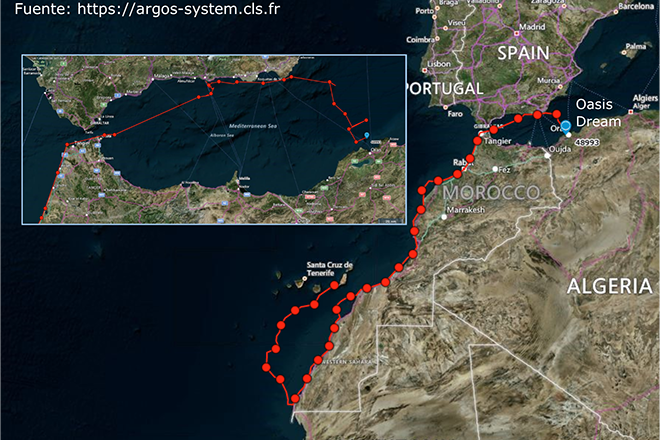Oasis Dream viajó con rumbo sur por aguas oceánicas y alcanzó la costa africana frente al sur del Sahara Oriental, hace aproximadamente cuatro meses. Después se dirigió hacia el norte hasta llegar a la Bahía de Río de Oro, frente a Dajla, donde permaneció tres semanas. A finales de julio pasó por el estrecho de Gibraltar entrando en el mar Mediterráneo, pasando frente a las costas de Granada y Almería, donde fue avistada por los buceadores, el pasado 9 de agosto. Actualmente se desplaza hacia el este.